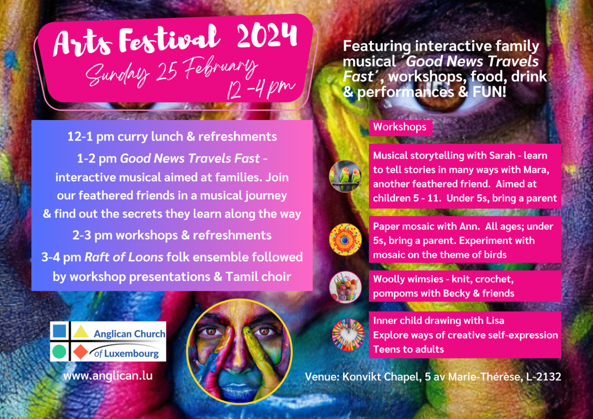 The Anglican Church of Luxembourg is hosting its annual Charity Arts Festival this Sunday, taking place at the Konvikt Centre chapel. The family event features an interactive family musical called Good News Travels Fast, various artistic workshops, musical performances and refreshments, which will be served throughout. Proceeds will be donated to the charities supported by the Anglican Church of Luxembourg, including Stëmm vun der Strooss, Friendship, Naledi South Africa, World Vision Romania, CoCo and Greyton Genadendal Education Fund.