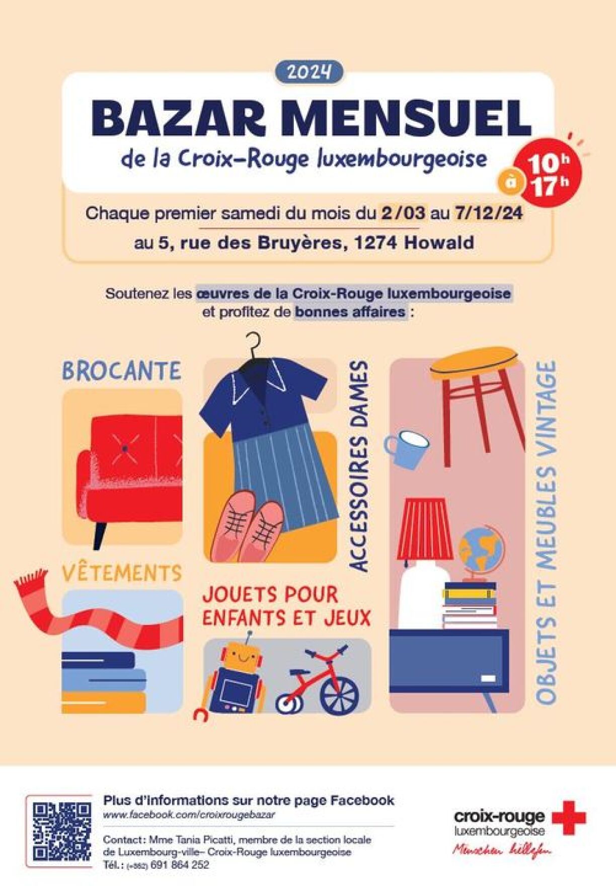 The Luxembourg Red Cross organises a monthly bazar to raise funds. Find second-hand furniture and clothing, accessories, children’s games and other good deals, all for a good cause. Every first Friday and Saturday of the month.