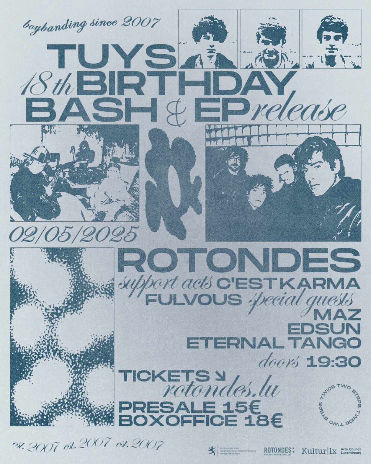 Local indie heroes TUYS are throwing a party at Rotondes to celebrate their new EP – and, shocking themselves with the number, their 18th band anniversary. Expect a packed night with guests like C’est Karma, Maz, Edsun, Poko from Eternal Tango and fresh faces Falvous. With a history of supporting Arctic Monkeys and The 1975, Tuys are living proof that starting a band in primary school really does pay off – and goes international.