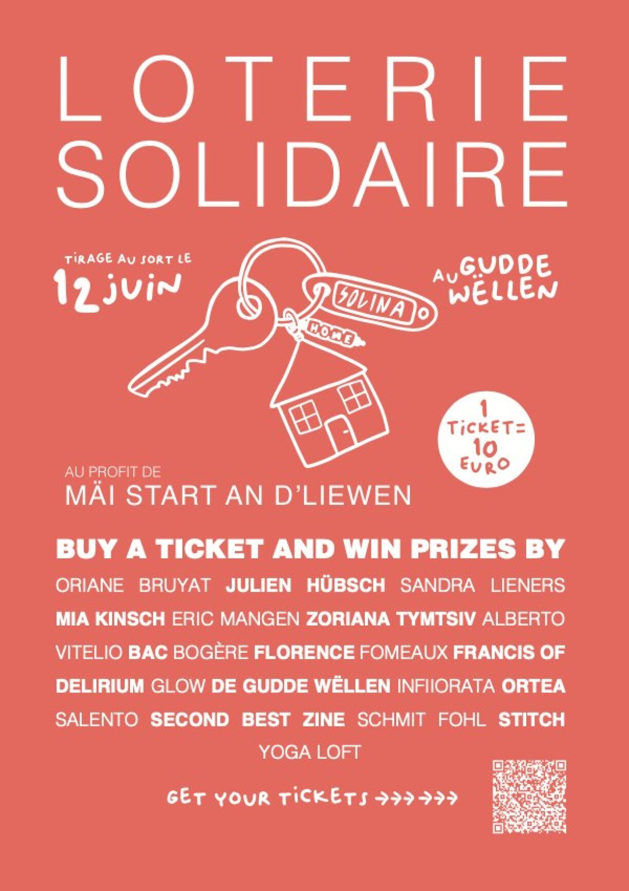 The second edition of Loterie Solidaire is being organised by Mia Kinsch and De Gudde Wëllen, who donate all proceeds to “Méi Staark an d’Liewen”, a project of Fondation Solina focusing on young adults and adults facing social and psychosocial challenges. Buy lots of tickets and join the event on Friday. Lucky winners will go home with artworks, gift vouchers, or goodies, generously donated by artists and partners.