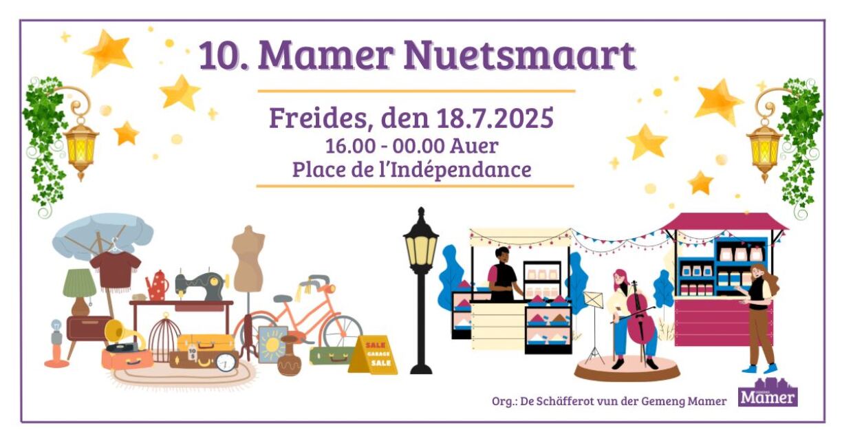 The 10th Mamer Night Market is being organised this Friday, bringing together local traders, second-hand sellers, entertainment, and refreshments on the Place de l’Indépendance from 4pm to midnight. Come along to this annual community event.