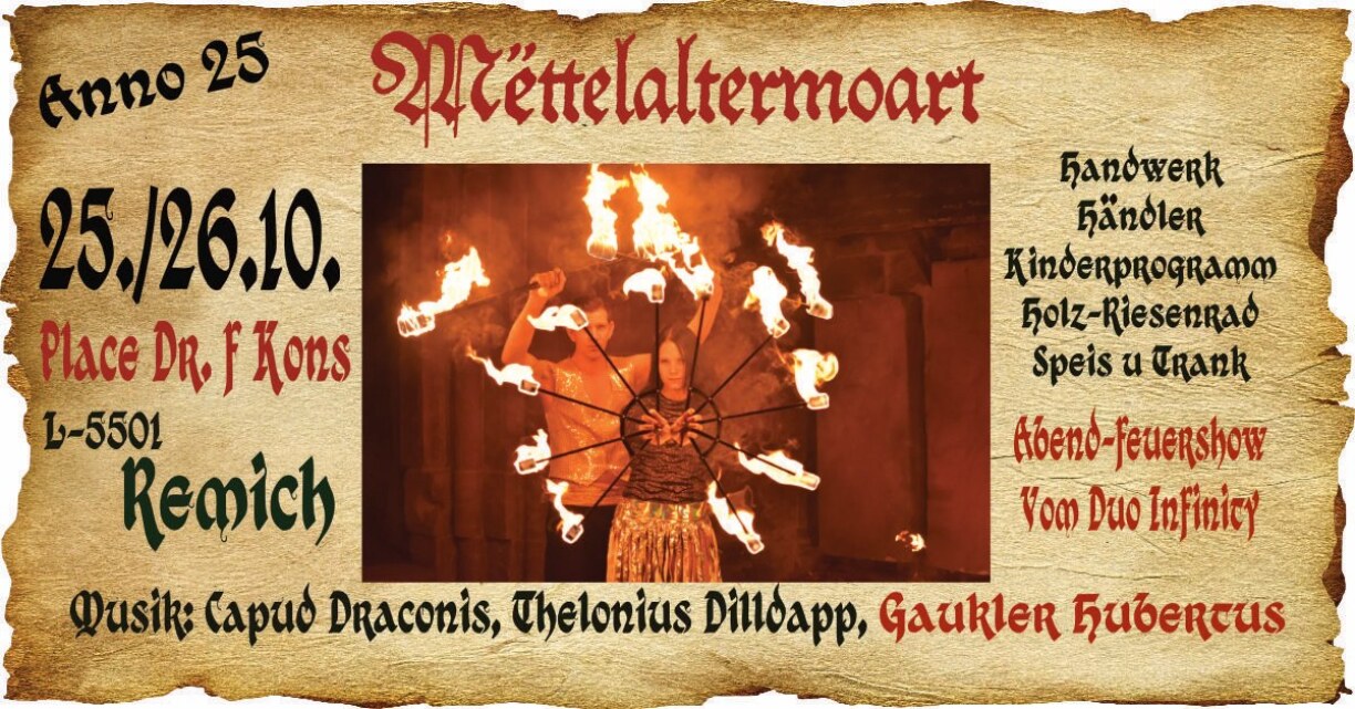 Travel back to the Middle Ages at the 8th Medieval Market in Remich, taking place on 25–26 October at Place Dr F. Kons. The square will come alive with the sounds of drums and bagpipes, the scent of roasted meats and spiced treats, and colourful stalls offering handmade crafts and curiosities. From lively street performances to family-friendly games and a dazzling fire show on Saturday evening, it’s a weekend full of magic, music, and medieval charm.