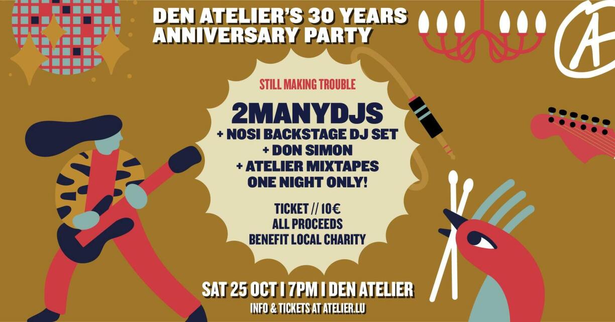 Fans are invited to celebrate three decades of music, mischief, and memories at Den Atelier. Belgian legends 2manydjs will headline the night, joined by den Atelier alumni DJs who will perform a special set under the motto “Mix Tape – 30 Years in 30 Tracks”. Nosi will take over the backstage, which will be opened to the public for the first time ever. All ticketing proceeds will benefit Interactions asbl, who do fantastic work throughout the country and an important job in den Atelier’s neighbourhood. Only a handful of tickets left!