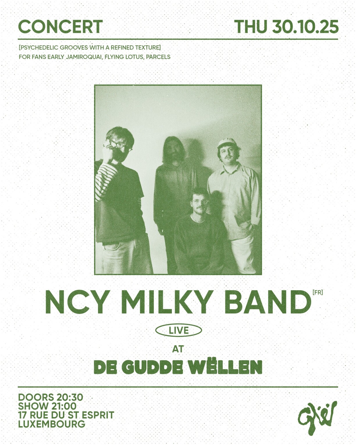 NCY Milky Band is made up of Louis Treffel, with Quentin Thomas on saxophone, and two graduates of the Paris Conservatoire, Antoine Léonardon on bass and Paul Lefèvre on drums. Since their victory at the Nancy Jazz Pulsations springboard in 2020, they have released four albums and set international stages on fire. Often considered a UFO in the French jazz scene, this group skilfully blends jazz, rock, hip hop and electronica to create psychedelic grooves with a refined texture.