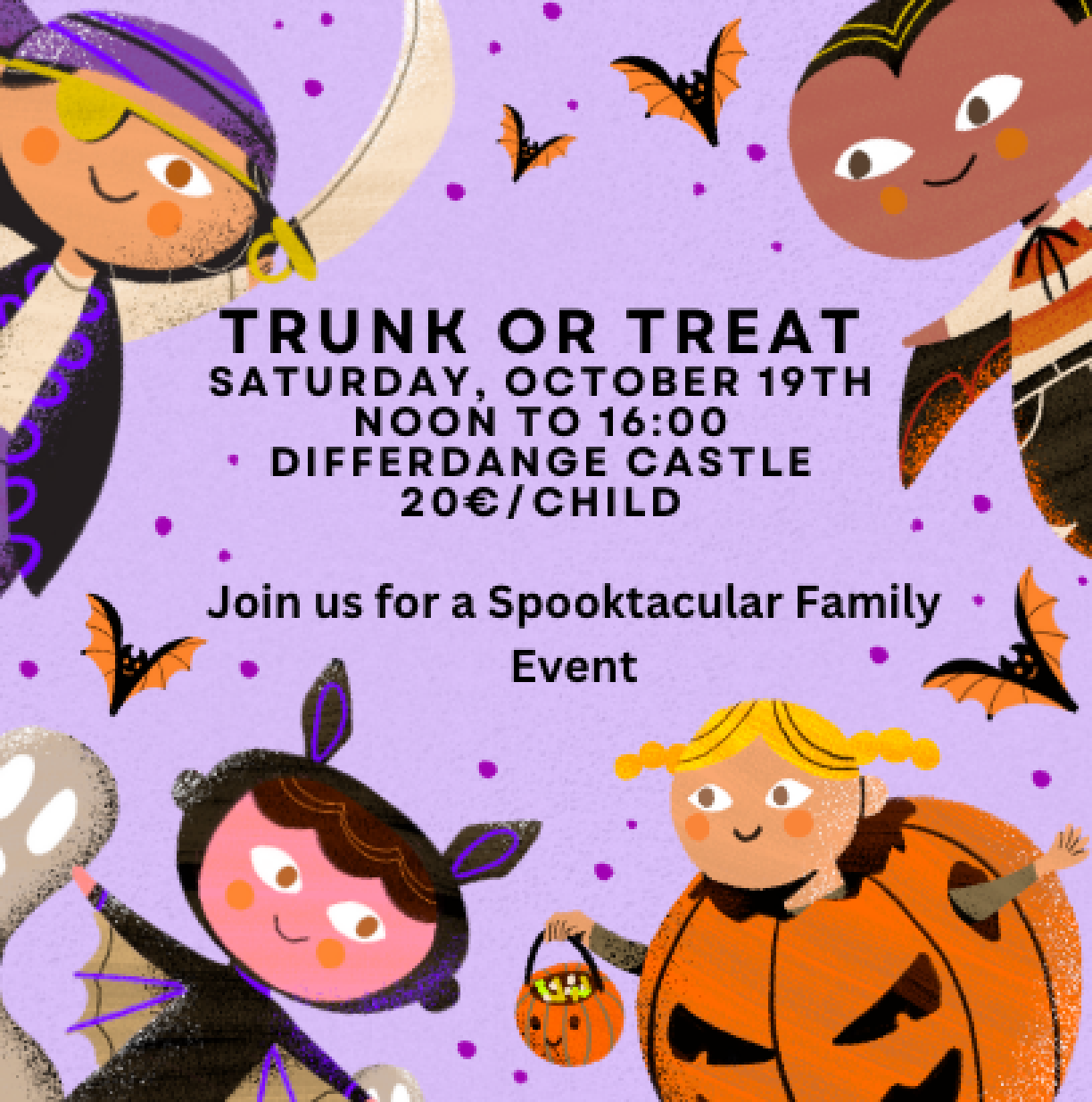 Enjoy a festive afternoon of decorated car trunks, candy, games, snacks, drinks and Halloween excitement. The American Women’s Club is holding its traditional “Trunk or Treat” Halloween event at the Chateau de Differdange from 12:00-16:00.Tickets are €20 per child. Adults go free.