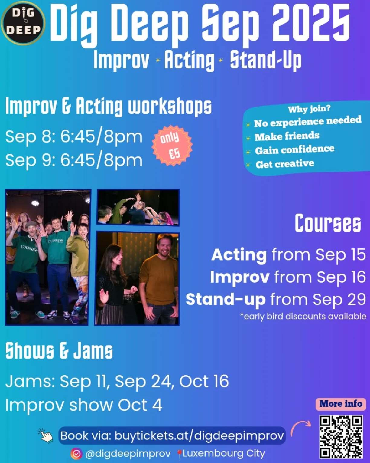 A new season of acting, improv and stand-up kicks off soon by our friend Melissa of Dig Deep Improv, with options for beginners and seasoned performers alike. From playful taster workshops to full courses and live shows, it’s all about creativity, confidence and plenty of laughs. A welcoming community where you can step on stage, sharpen your skills and have fun along the way. Reach out to Melissa for any questions or details and grab your tickets.