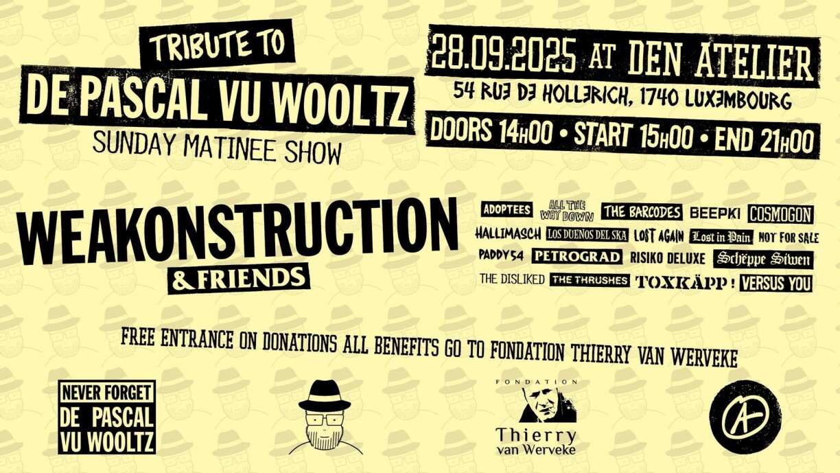 Friends and fellow musicians come together for a punk rock tribute to Pascal Vu Wooltz, whose spirit lives on through the music he loved. From afternoon into evening, multiple bands – including Weakonstruction with special guests – will take the stage. Entry is free, with donations going to the Fondation Thierry Van Werveke.