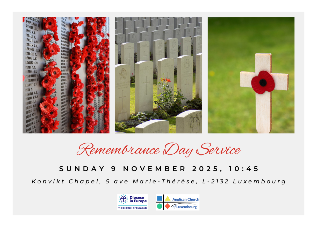 The Anglican Church of Luxembourg’s annual Remembrance Day Service will take place on Sunday 9 November at 10.45am. Everyone (children included) is invited to this service; the only ask is that those wishing to attend arrive and are seated by 10.45am at the latest.