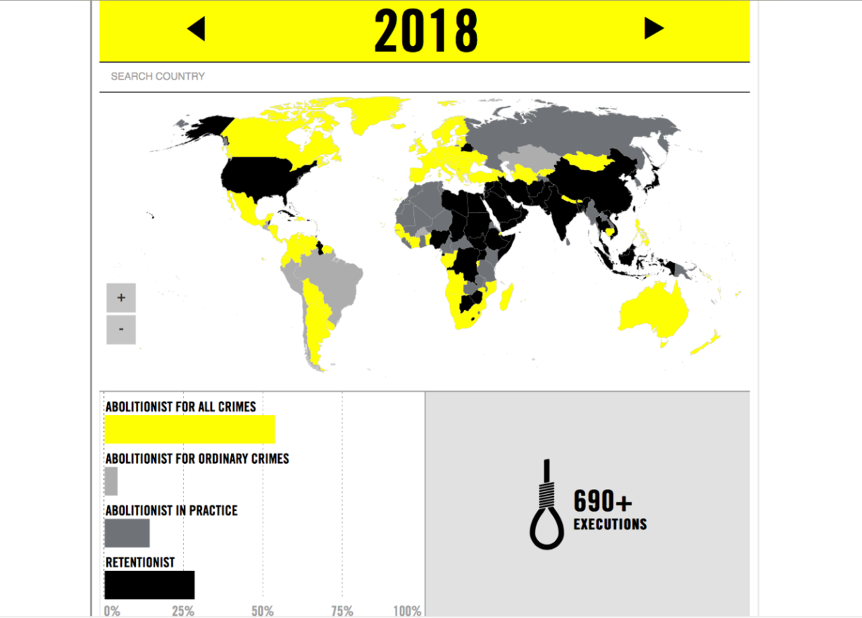 In 2018, Amnesty International recorded at least 2,531 death sentences in 54 countries. Most executions are taking place in China, Iran, Saudi Arabia, Vietnam, and Iraq. According to Amnesty, “China remains the world’s top executioner – but the true extent of the use of the death penalty in China is unknown as this data is classified as a state secret.”