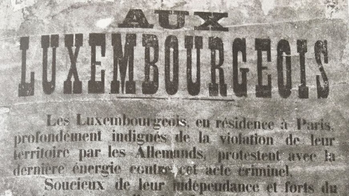 It read, “To Luxembourgers: The Luxembourgish residents of Paris, profoundly indignant at the violation of our territory, and concerned about the future of the country, will protest this criminal act with every drop of our energy. Protected of our independence and undaunted by the size of the task ahead, we Luxembourgers are invited to sign up immediately as volunteers for the profit of the great and noble French nation.”