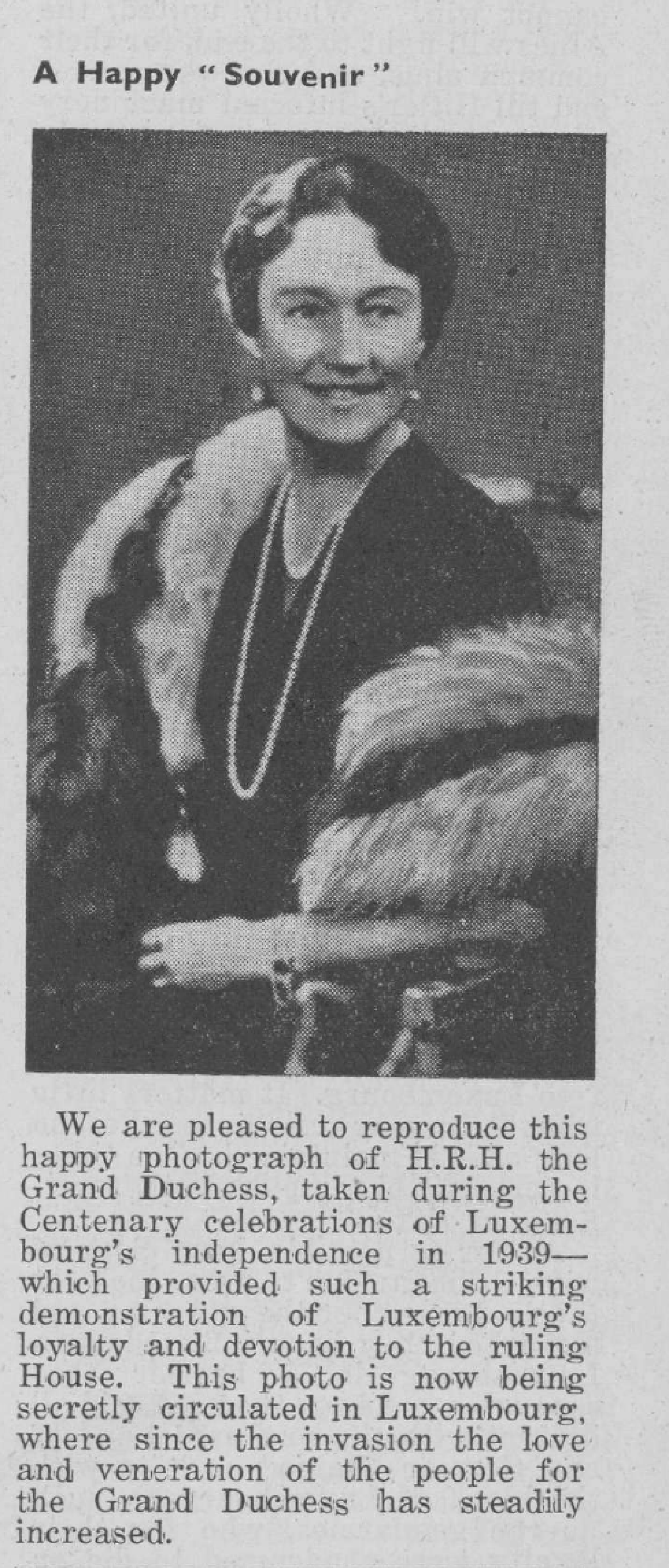 The exiled government’s press service published the Luxembourg Bulletin from 1942 onwards, with publication continuing beyond the war until 1954. Published both in London and Montreal, the Luxembourg Bulletin was mainly published in English - likely the first precursor to the English news media in Luxembourg! Publication was sporadic, as both bulletins only published on four occasions in 1942, although at different times. The Grand Duchess, in addition to her BBC broadcasts, also wrote messages that were printed in the Luxembourg Bulletin. The first edition of the Luxembourg Bulletin, published on the two-year anniversary of the Nazi Occupation on 10 May 1940, even offers a ‘happy souvenir’ photograph of the sovereign taken during the Grand Duchy’s independence centenary celebrations in 1939, writing that the photo is being secretly circulated in Luxembourg.