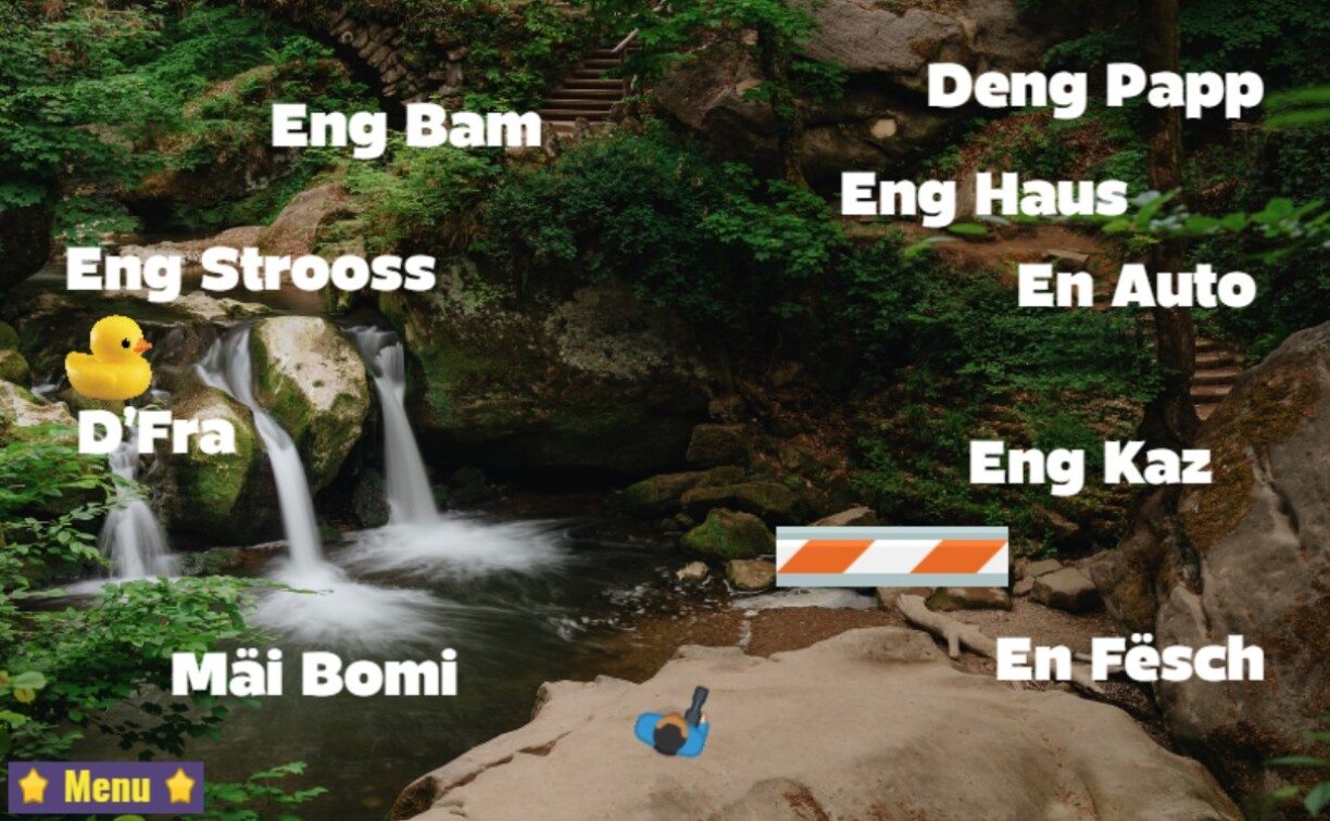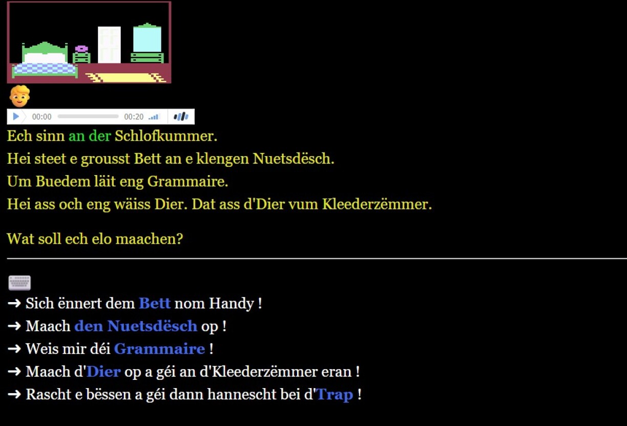 With various possibilities and everyday scenarios based on your commands, you can guide Jérôme through his house and learn Luxembourgish along the way.