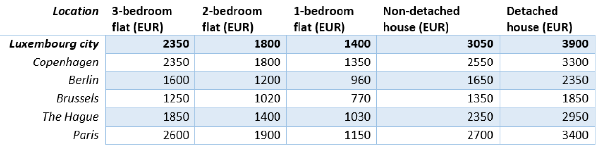Housing is notoriously expensive in Luxembourg. Data from Statec (the national statistics agency) suggest that the average household spent €23,356 per year on rent, charges, heating and lighting in 2017. Unfortunately this is the most recent data available.As a means of comparison, Eurostat also provide average data for various housing types for major European cities (2017):