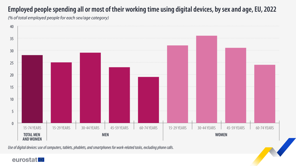 Interestingly, the situation reversed for people with a high level of education, with 47% of men and 44% of women spending most or all of their working time using digital devices.
