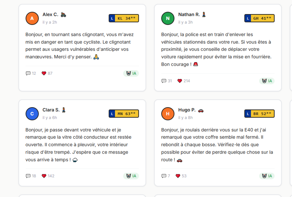 PlateWave was designed as a genuine communication tool, not as another place where commuters can let out their road rage. This is why every message is moderated by artificial intelligence. The AI rephrases each message without altering its factual content. A message dictated in anger, such as “Idiot, you cut me off”, would be transformed into something along the lines of: “Hello, by turning without signalling, you put me in danger. Please be mindful of that.”