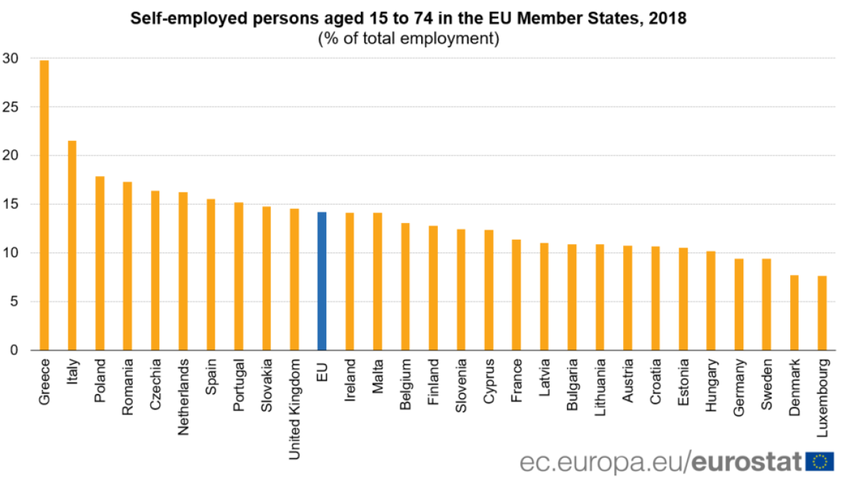 In the EU as a whole, self-employed people account for 14% of total employment. The highest rate of self-employment is found in Greece (30%), Italy (22%), and Poland (18%). Luxembourg (8%) can be found on the opposite end of the spectrum together with Denmark (also 8%), followed by Sweden and Germany (both 9%).