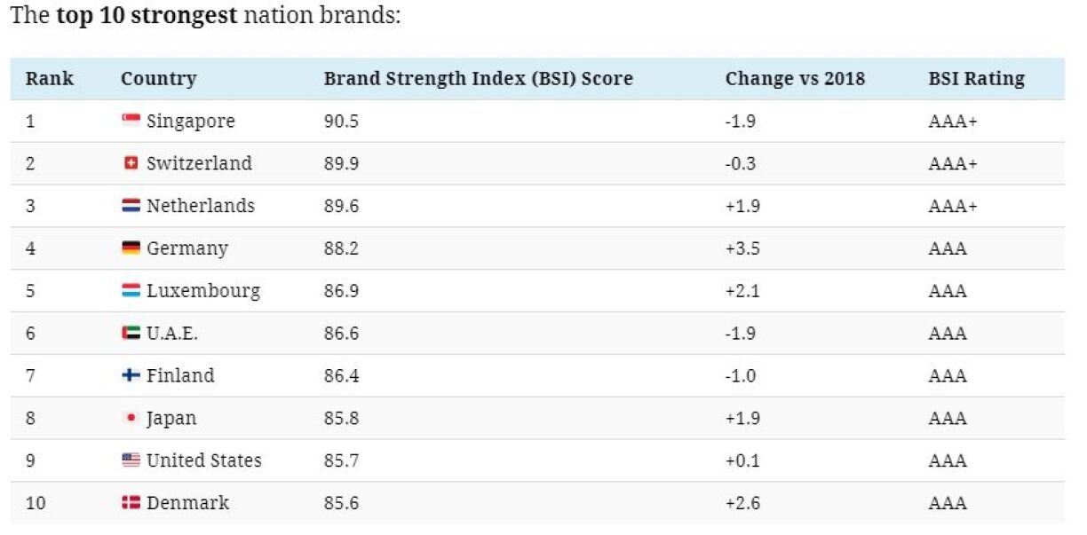 Luxembourg has received a AAA rating on Visual Capitalist’s ‘The World’s Most Valuable Nation Brands’ list in terms of Brand Strength, placing just behind Germany and gaining 2.1 points on the 2018 ranking.