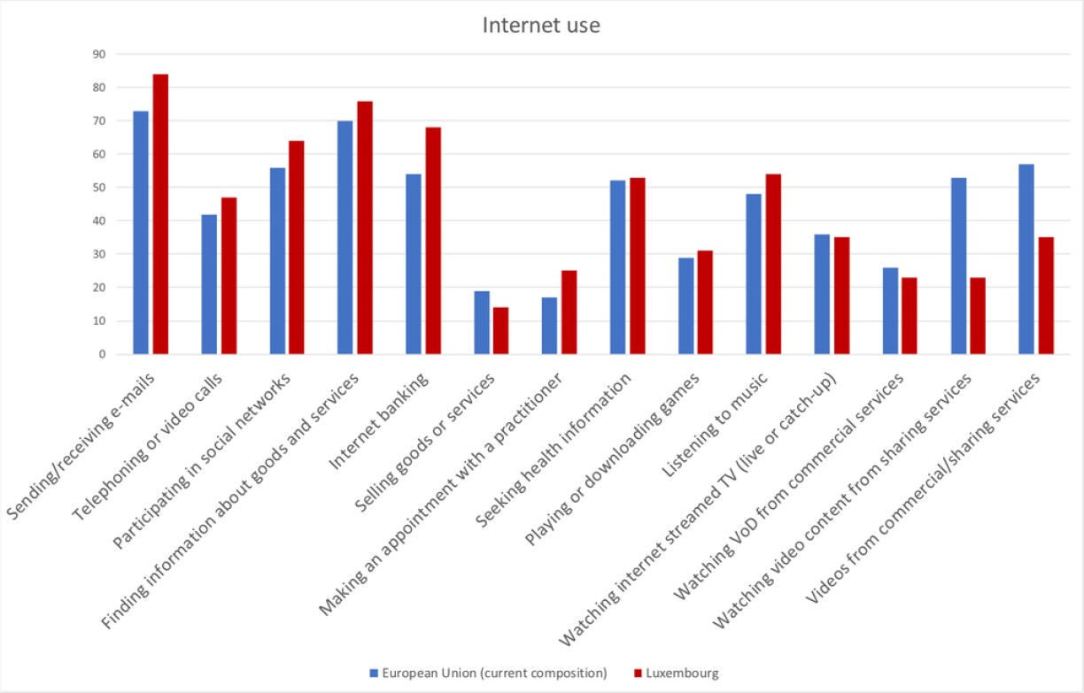 Luxembourg (red) is above the EU average (blue) when it comes to sending e-mails, video/voice calls, social networking, and most other categories. However, we’re behind the EU average in terms of watching TV streams/replay, video on demand content, video watching on sharing sites, and using other commercial video streaming services.