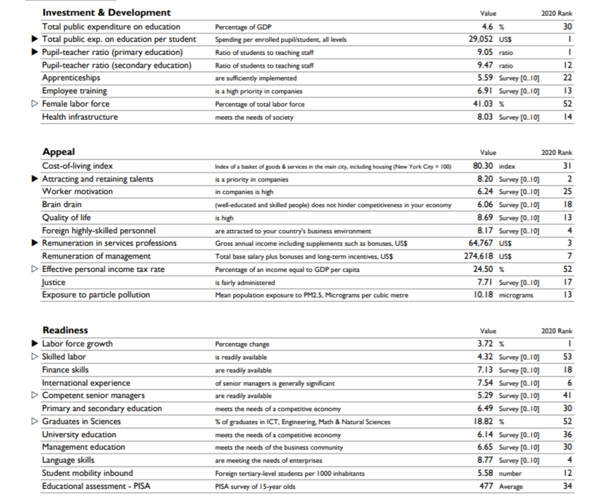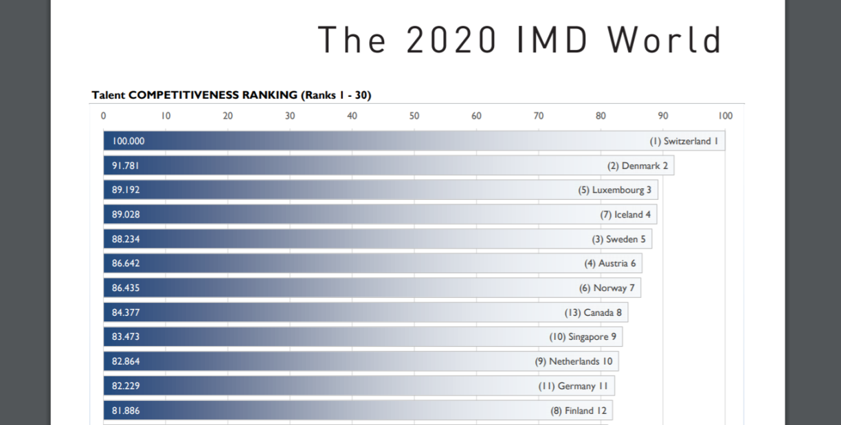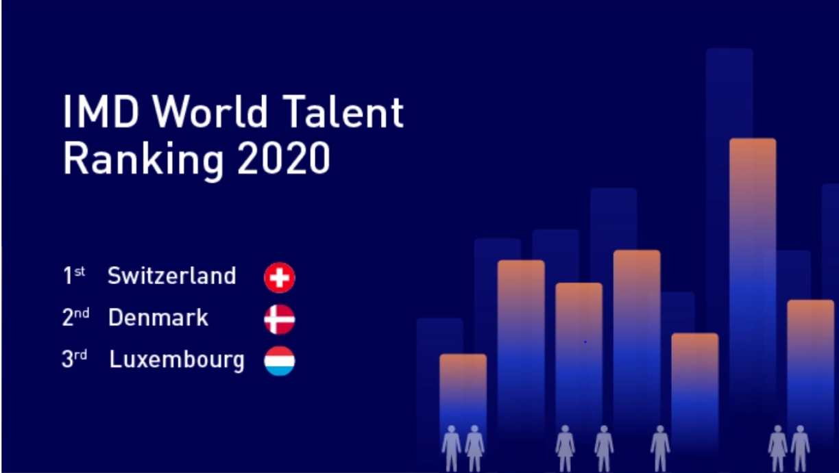 Switzerland leads the way for the fourth year in a row, Denmark is second and Luxembourg third in the IMD World Talent Ranking 2020.