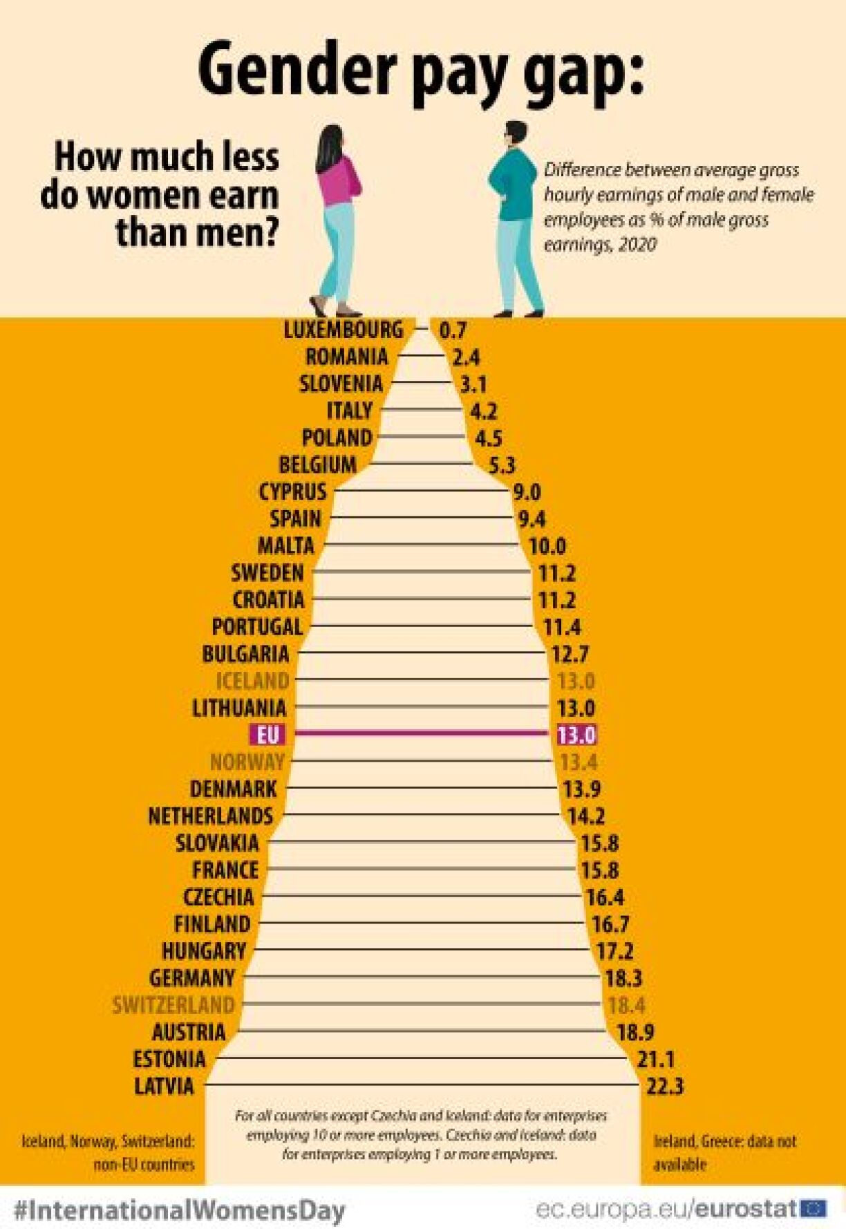 On average, women continue to earn less than men. The size of the pay gap varies from country to country. In the European Union, the gender pay gap is as high as 13%, according to figures from 2020. You can think about it like this: if a man receives €1 for his work, a woman gets only €0.87 for the same job. The widest gap is found in Lithuania at 22.3%. Luxembourg’s neighbouring countries Germany and France also score quite low in the ranking. In Germany the pay gap is 18.3%, while in France, it is 15.8%. In Belgium, the gender pay gap is much smaller, at “only” 5.3%.