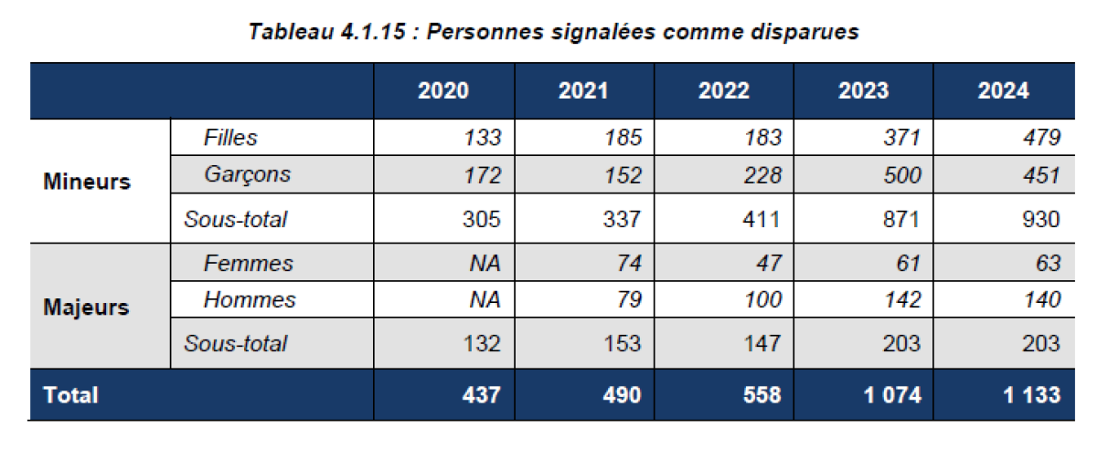 The number of people reported missing has increased notably in recent years, particularly among minors. While 305 minors were reported missing in 2020, this figure rose to 930 in 2024. For adults, the number increased from 132 to 203 over the same period. This represents an overall rise from 437 to 1,133 cases.