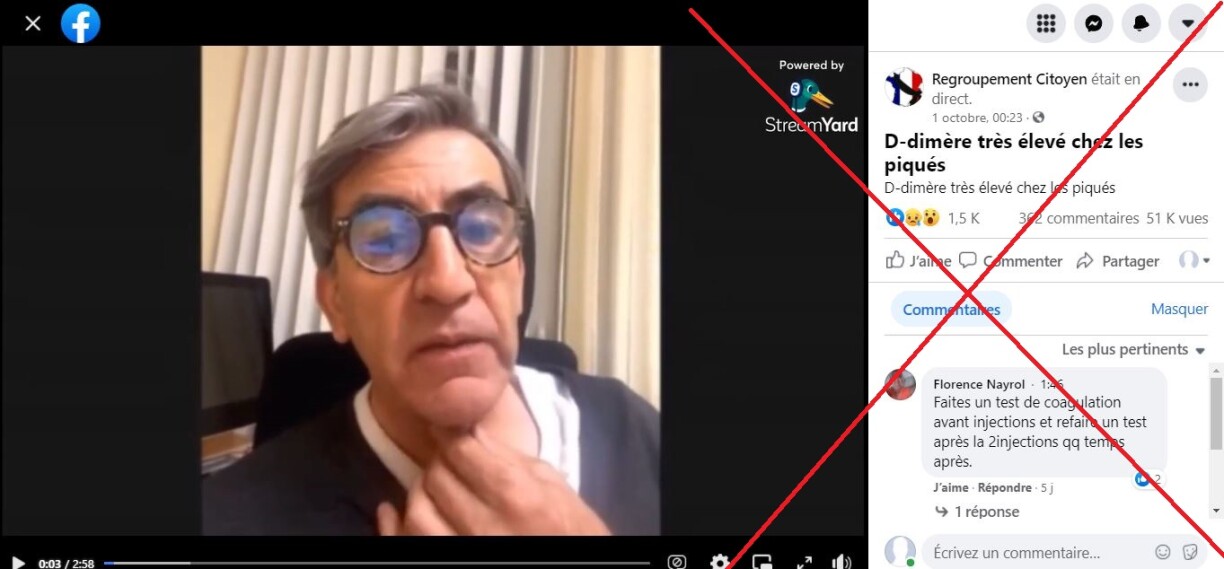 He explains that he found D-Dimer levels - a possible marker of thrombosis - “above average” in one in five vaccinated patients. But “the increase in D-Dimer is not specific to thrombosis”, as explained to AFP by the French Group of Studies on Haemostasis and Thrombosis (GFHT) and several experts. “Very high levels of D-Dimer in people who have been pricked,” says the caption of this video, which has been shared more than 5,700 times on Facebook since 1 October. On the screen, Dr Benoît Ochs states that “one in five patients” would have D-Dimer levels “above the norms”, before concluding that “there is a risk that these people will develop micro-thrombosis all over the body and by dint of this, all die next year.” He also claims that many thromboses are found in the placentas of pregnant women. His claims are also being echoed on Twitter.
