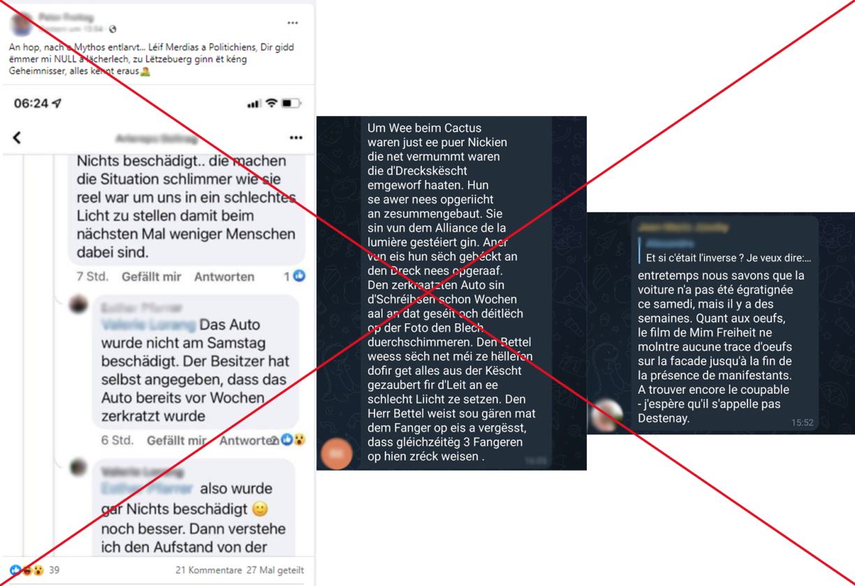 An RTL photographer was also present at this same location last Saturday. His images show the same black car parked outside Bettel and Destenay’s home, surrounded by protesters. When questioned by RTL, Destenay’s entourage confirmed it was indeed his car depicted in the images of the damaged vehicle.