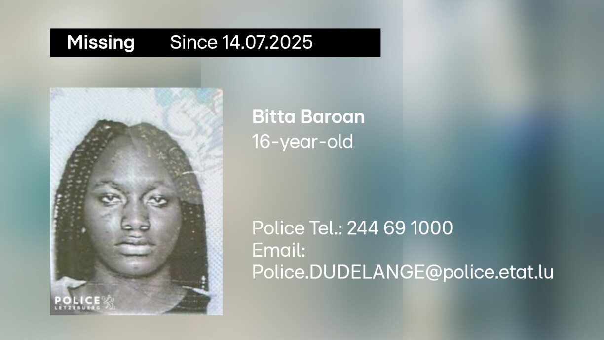 The police are appealing to the public for any information that could assist in locating her. Anyone with relevant information is urged to contact the Dudelange police via 244 69 1000 or by e-mailing Police.DUDELANGE@police.etat.lu..