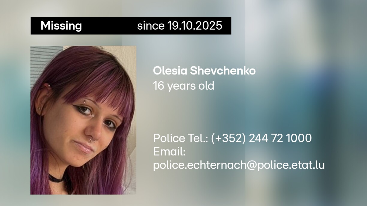 Anyone with information about the missing person should contact the Echternach police on (+352) 244 72 1000 or by email at police.echternach@police.etat.lu.