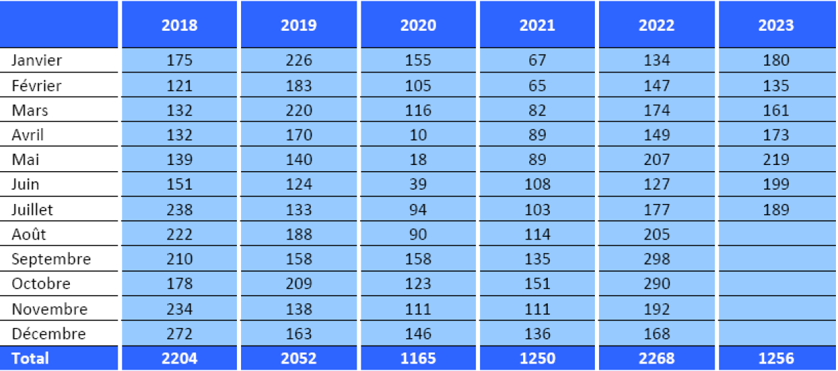 Applications increased by 6.3% - specifically 12 additional requests - compared to July 2022; this is the highest number for any July since 2018, when 238 requests were submitted. According to Directorate statistics, 2018 witnessed a particularly high number of asylum requests, reaching 2,204. Nearly 1,000 people were granted refugee status that year.