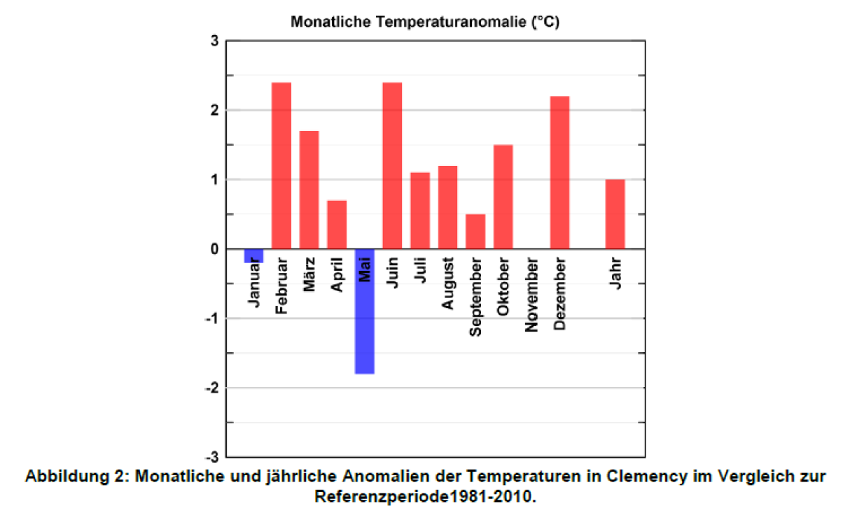 On average, temperatures were 1 degree Celsius too hot. In July, a record high of 40.8 degrees Celsius was measured in Steinsel, while an unseasonably warm February recorded temperatures of 23.9 degrees Celsiusin Remich.