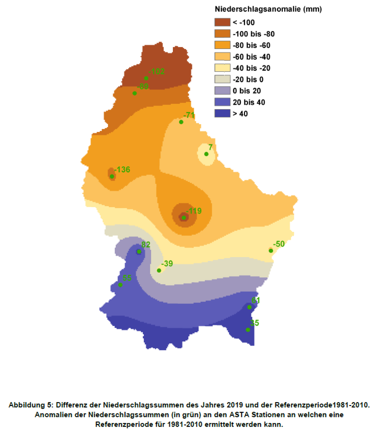 In terms of precipitation the country was split down the middle, with the north experiencing far too little rain, while the south had too much. The biggest deficit was in Eschdorf with -136mm of rain, while Koerich in the south had 62mm too much.