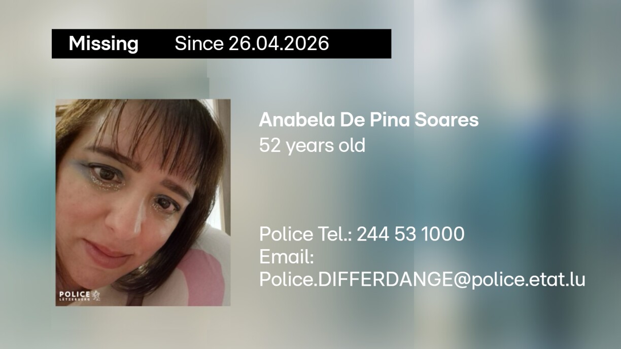 Anyone with information on her whereabouts is asked to contact the Differdange police station by calling +352 244 53 1000 or by emailing Police.DIFFERDANGE@police.etat.lu.