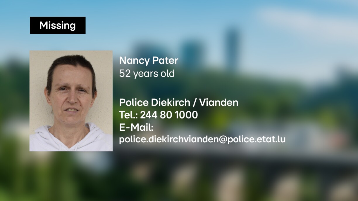 Anyone able to provide information on the missing person is asked to contact the Diekirch/Vianden police station, either by calling (+352) 244 80 1000 or by sending an e-mail to police.diekirchvianden@police.etat.lu.