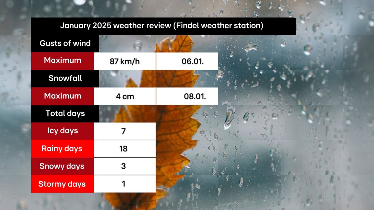 The highest wind gusts in January were recorded on 6 January, reaching 87km/h, making it an especially stormy day. Snowfall was minimal, with just 4cm on 8 January and only three days of snow overall. However, the Administration of Technical Agricultural Services (ASTA) station in Reiler reported 5.8cm of snow as early as 2 January, and light snowfall persisted for nearly half of the month.