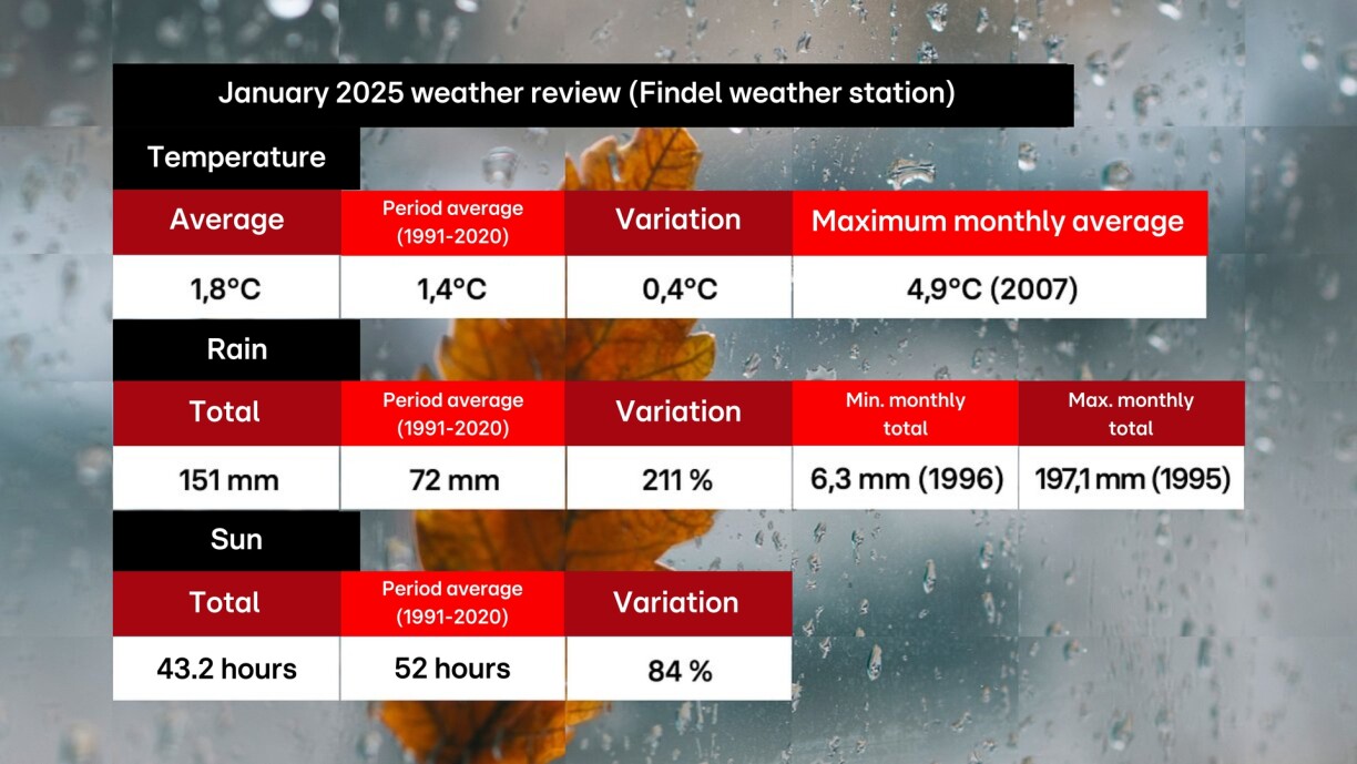 January temperatures were slightly above average but remained within a moderate range, without any extreme fluctuations. The highest temperature recorded at the Findel weather station was 12°C on 6 January while the lowest dropped to -7.1°C on 14 January.
