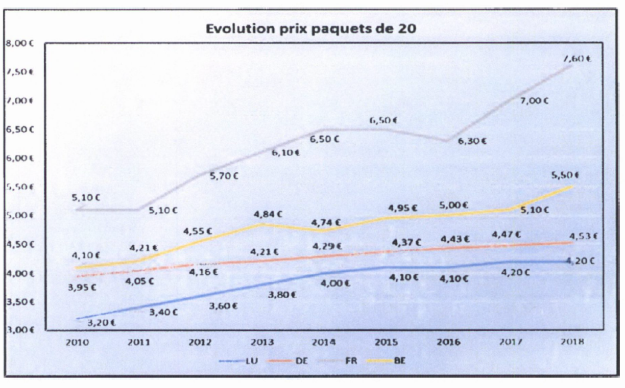 Even though the minister refrained from commenting on factors that potentially played a role in sales growth, the graph above provides some answers. The average price for a pack of cigarettes is comparatively high in neighboring countries such Germany and Belgium and significantly higher in France. It should therefore come as no surprise that many smokers cross the Luxembourgish border to stock up.