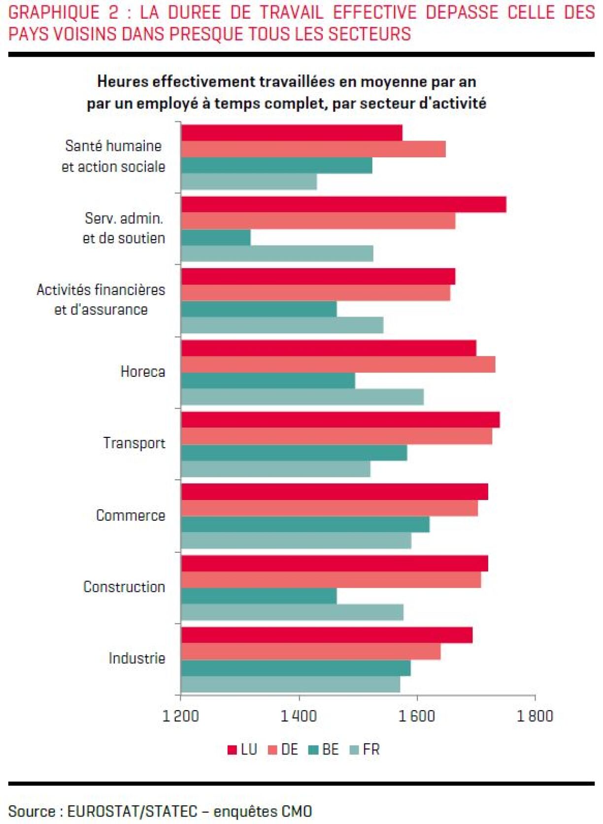 As examined by Statec, Luxembourg’s longer working hours compared to its Belgian and French neighbours hold true in all sectors, especially in the administration and support sector, which has a considerable gap between the hours worked by Luxembourgers and by Belgians. The Germans, on the other hand, do overtake Luxembourgers in the hospitality and health sectors.