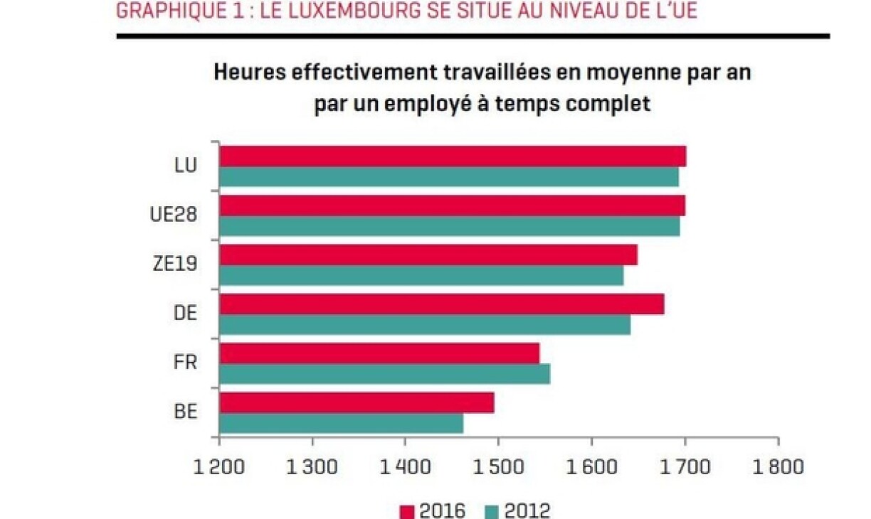 The study calculated the average of hours worked by a full-time employee. The results reveal that whilst Luxembourgers are wholly within the European average, they do work more than the average of the Eurozone (1,649).