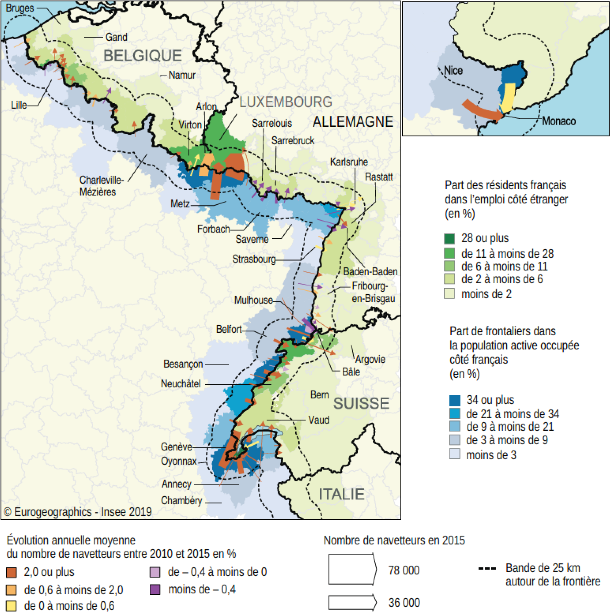 Even in areas which are further afield from France’s borders, such as the area surrounding Metz or the Pays-Haut region, cross-border workers make up between 9 and 21% of the active population.