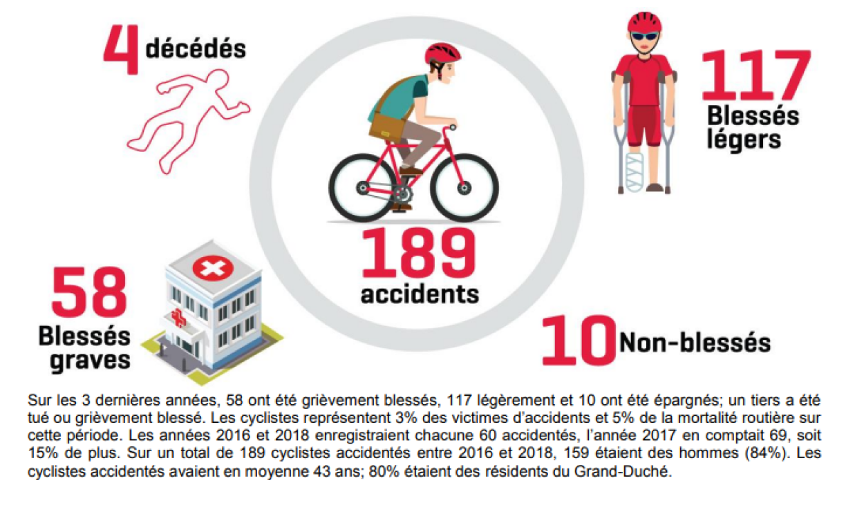 Between 2016 and 2018, four cyclists died on Luxembourg roads, and 58 were gravely injured. This means around 33% of accidents involving cyclists ended in serious injuries.