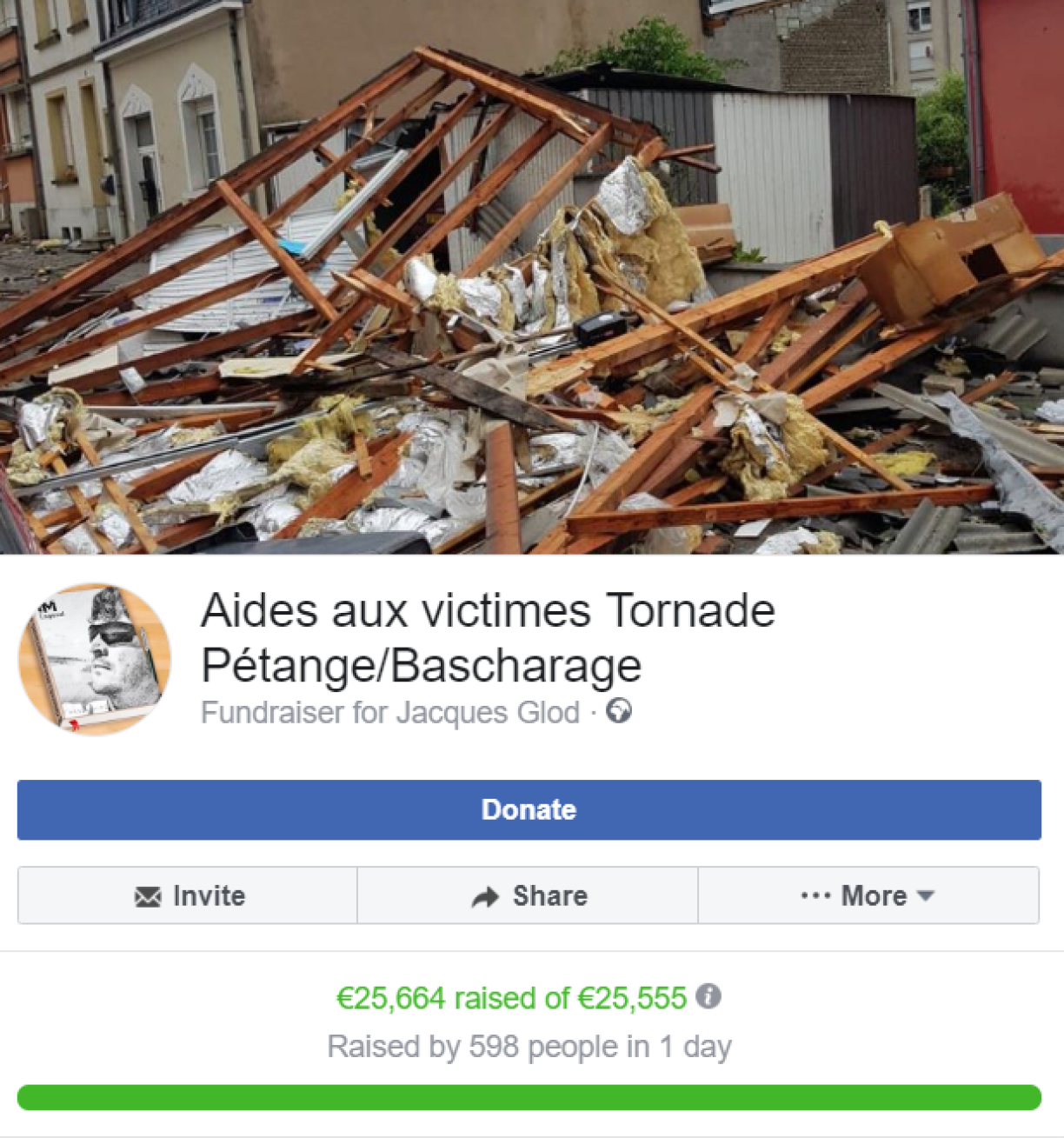 A fundraiser initiated by Jacques Glod on Facebook has raised over €54,000 in two days. The tornado that ravashed southern Luxembourg Friday night damaged over 160 homes, injuring 19 people, of which one person critically. Countless social media users are taking in people that have lost their homes, offering their apartments, homes and studios as temporary accommodation.