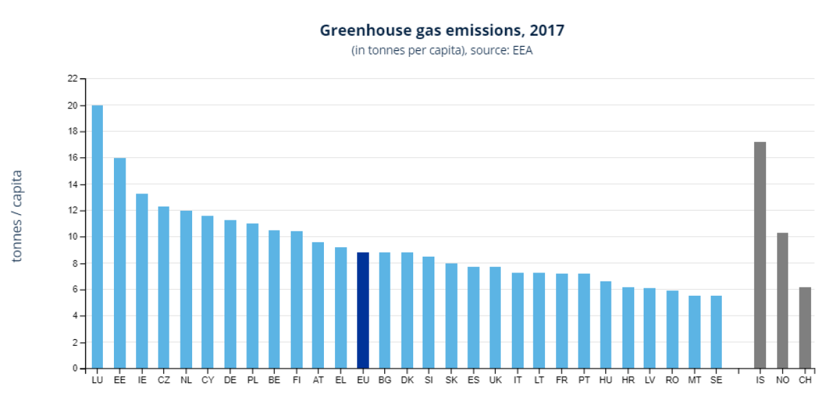 The Eurostat data show that Luxembourg’s CO2 emissions stand at 20 tonnes per capita, with an EU average of 8.8 tonnes - which means Luxembourg’s emissions are 2.2 times higher than the average. Estonia comes in second at 16 tonnes, followed by Ireland (13.3), the Czech Republic (12.3), and the Netherlands (12).