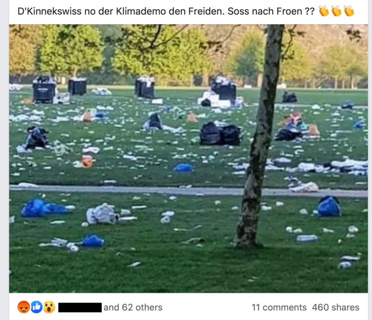 Earlier this Sunday, a Facebook post has been making the rounds in Luxembourg, showing an image of a park covered with litter. The post claimed that this is the Kinnekswiss park, where the Fridays for Future protest ended after marching through Luxembourg.