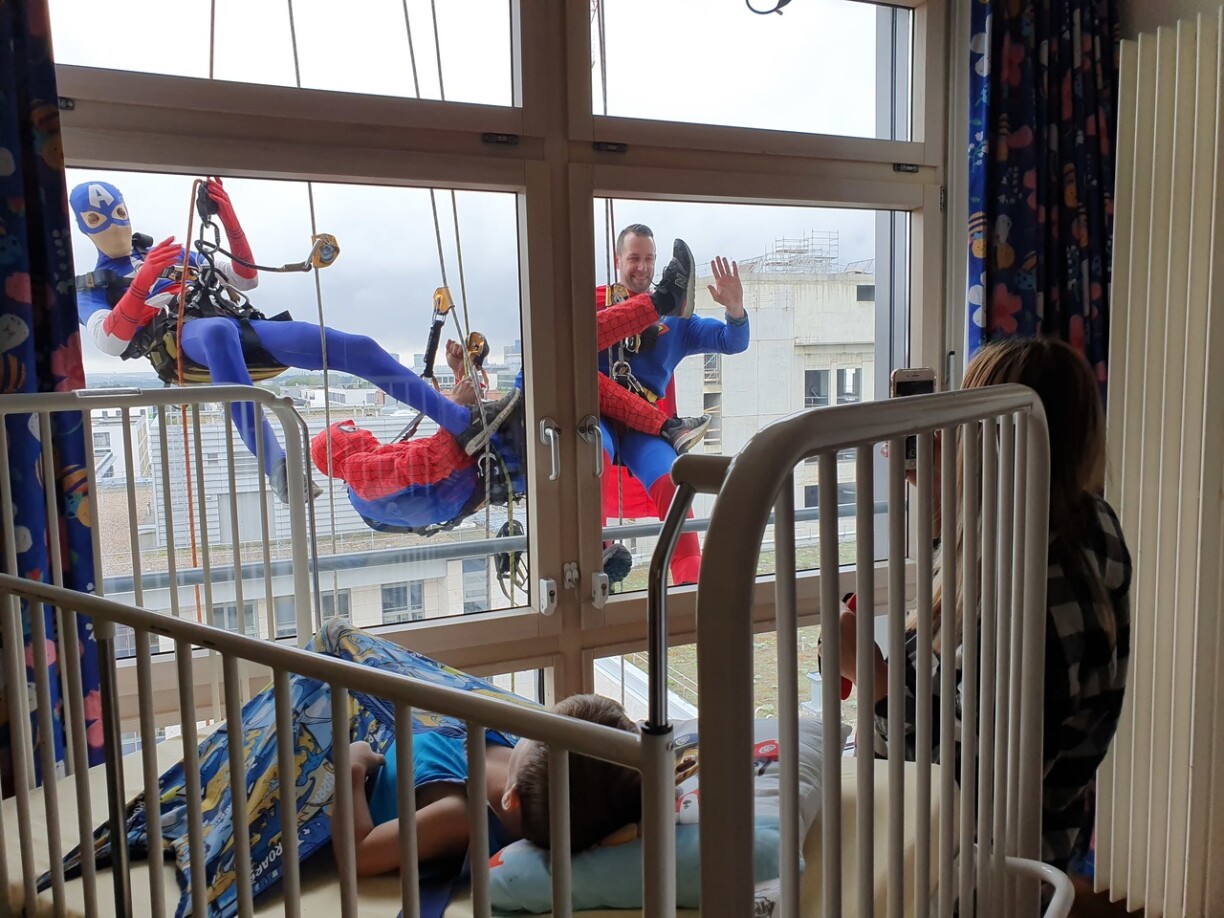 Children on the paediatric ward were delighted on Monday when their favourite superheroes came to visit, with the patients able to wave at the visitors from their beds.