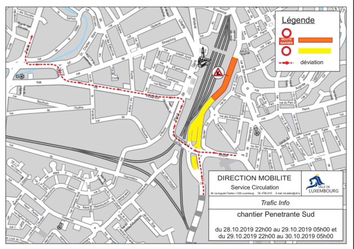 The Bridges and Roads Authority will be carrying out works on the Chaussée de la Pénétrante Sud between Rue de Bonnevoie and the Route de Thionville from 10pm on Monday the 28 October to 5am on Wednesday the 30 October.