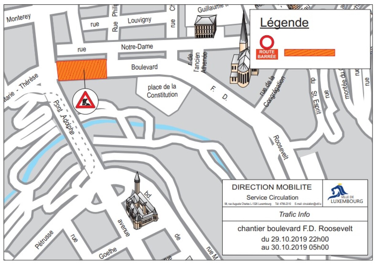 Luxtram will be working on Boulevard Franklin D. Roosevelt between Place de Bruxelles and Rue Philippe II, and will involve the following traffic changes from 10pm on Tuesday the 29 October until 5am on Wednesday the 30 October: