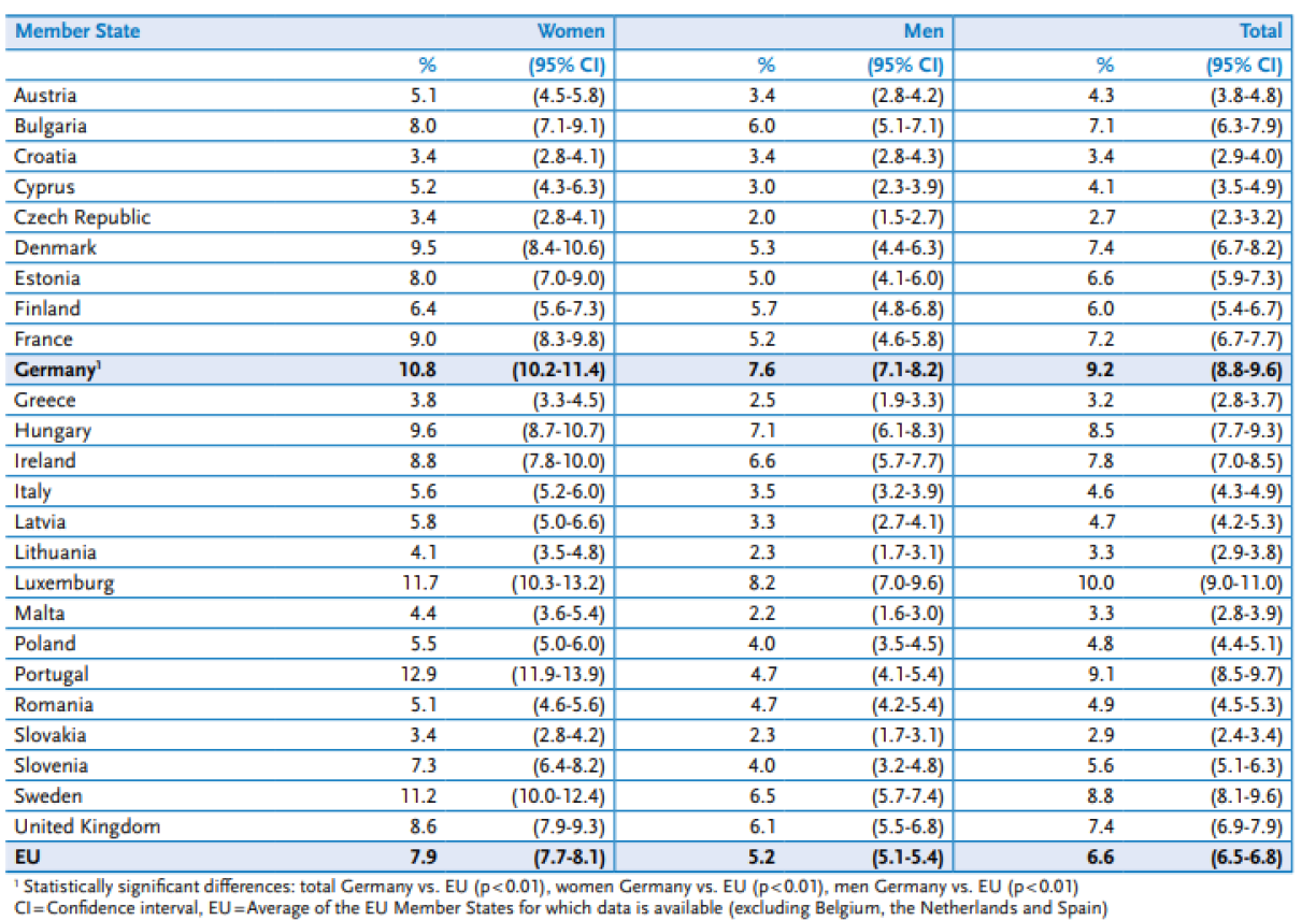 While the EU average is 6.6% of the population, Luxembourg comes in at 11% - a full five percentage point above the EU as a whole. Neighbouring Germany comes in second place at 9.2%, with Portugal in third (9.1%). As for our other two neighbouring countries, no data was presented for Belgium, while France’s prevalence is also above the EU average at 7.2%.