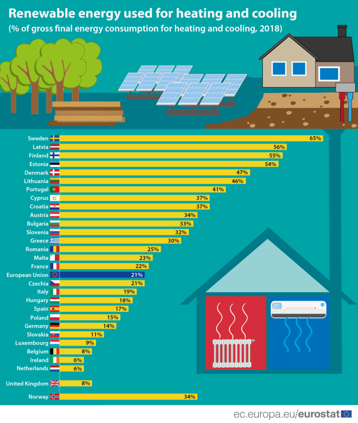 Sweden stands out with close to two thirds (65%) of the energy used for heating and cooling in 2018 stemming from renewable sources. Latvia, Finland, and Estonia are also leading the pack.