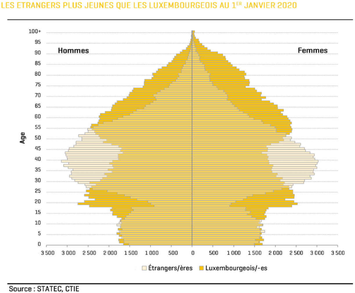 Luxembourg’s population pyramid shows that the highest percentage of Luxembourgers can be found in the age group 55+. Foreigners for example only account for 29% in the 65+ age group. The opposite holds true in the 30-53 age group, which has more foreign nationals than Luxembourgers.